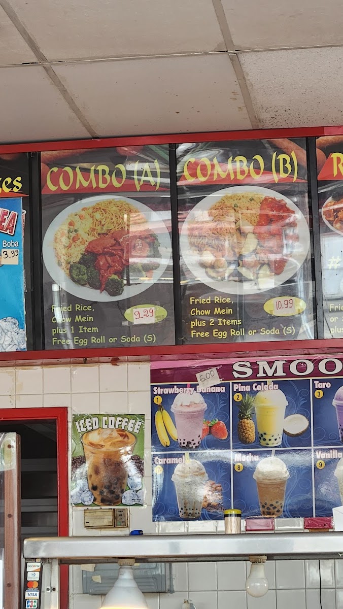 Chow mein, fried rice or steamed rice and choose one item, like teriyaki, orange chicken, beef broccoli, spicy chicken wing, sweet sour chicken, mushroom chicken, potato chicken, jalapeño chicken. No soda or egg roll comes with combo A.